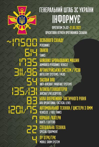Qeyd olunub ki, 24 fevral-31 mart tarixlərində Rusiya tərəfinin şəxsi heyət sıralarında itkisi təxminən 17 500-ə çatıb.