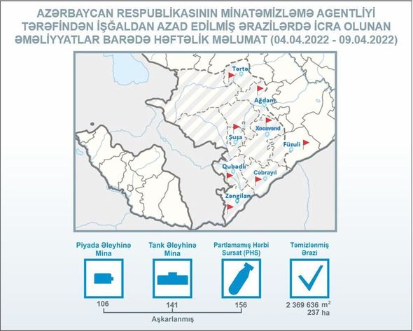 ANAMA-dan verilən məlumata görə, aprelin 4-dən 9-dək Tərtər, Ağdam, Füzuli, Şuşa, Qubadlı, Cəbrayıl və Zəngilanda aparılan minatəmizləmə əməliyyatları zamanı piyada əleyhinə 106, tank əleyhinə 141 mina və 156 partlamamış hərbi sursat aşkarlanaraq zərərsizləşdirilib.