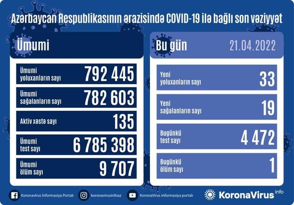 Azərbaycanda son sutkada koronavirus (COVID-19) infeksiyasına 33 yeni yoluxma faktı qeydə alınıb, 19 nəfər müalicə olunaraq sağalıb.
