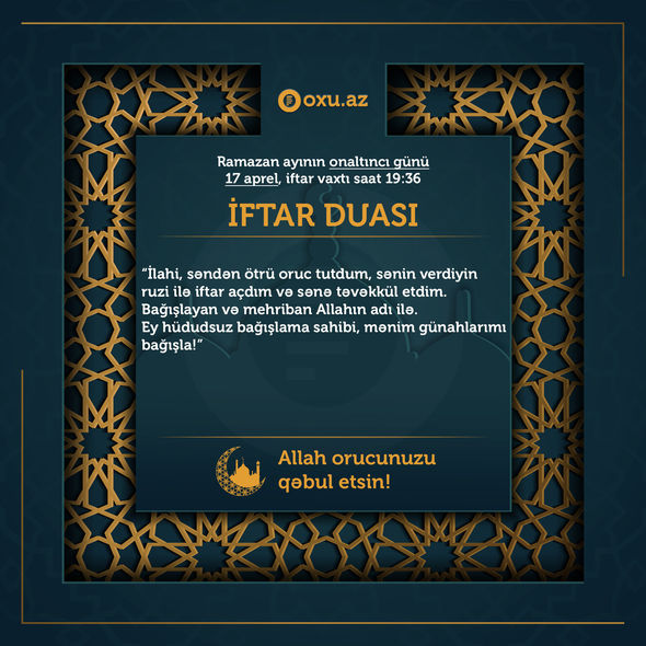 Tərcüməsi: “İlahi, səndən ötrü oruc tutdum, sənin verdiyin ruzi ilə iftar açdım və sənə təvəkkül etdim. Bağışlayan və mehriban Allahın adı ilə. Ey hüdudsuz bağışlama sahibi, mənim günahlarımı bağışla!”