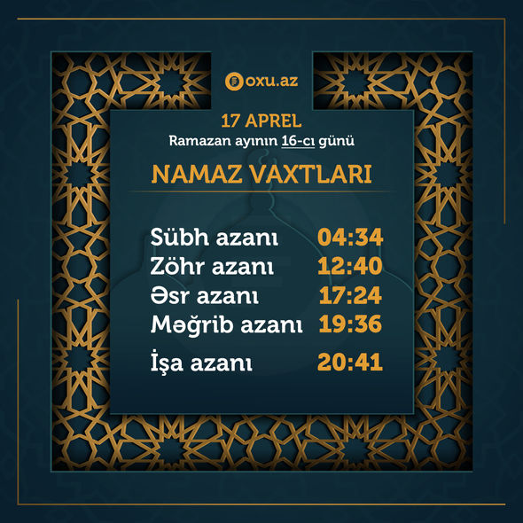 Qafqaz Müsəlmanları İdarəsinin açıqladığı Ramazan təqviminə əsasən, aprelin 17-də 04:29-da, iftar vaxtı 19:36-dadır.