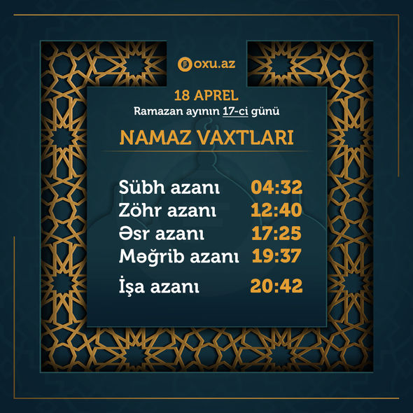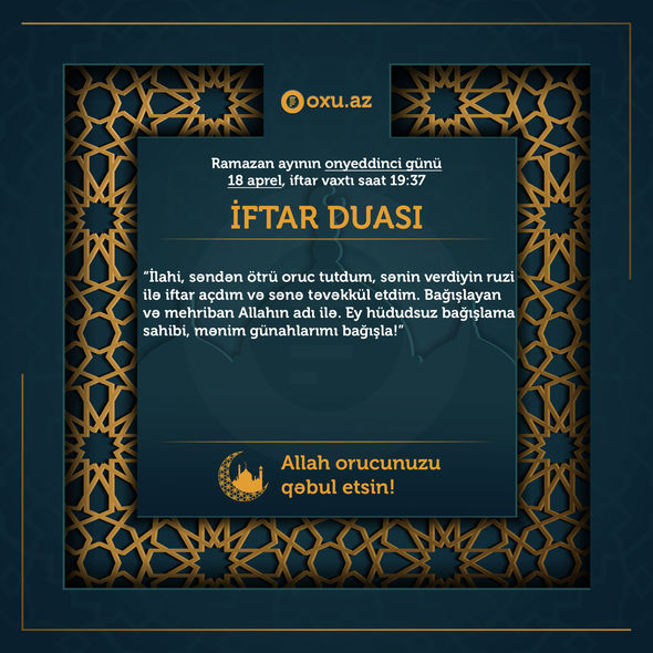 Qafqaz Müsəlmanları İdarəsinin açıqladığı Ramazan təqviminə əsasən, aprelin 18-də iftar vaxtı 19:37-dədir.