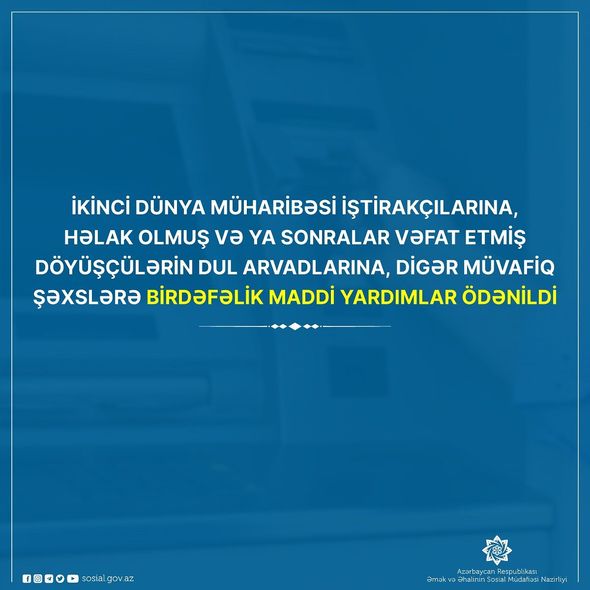 Nazirlikdən verilən məlumata görə, sərəncamla nazirlik həmçinin İkinci Dünya müharibəsində həlak olmuş və ya sonralar vəfat etmiş döyüşçülərin dul arvadlarına, həmin dövrdə arxa cəbhədə fədakar əməyinə görə orden və medallarla təltif edilmiş şəxslərə, İkinci Dünya müharibəsi illərində döyüş cəbhələrinin arxa hüdudları, yaxud döyüşən donanmaların əməliyyat zonaları daxilində ordunun və donanmanın mənafeyi üçün tapşırıqları yerinə yetirmiş xüsusi birləşmələrin işçilərinə, İkinci Dünya müharibəsi dövründə Leninqrad şəhərinin müdafiəsinə görə müvafiq medal və döş nişanı ilə təltif edilmiş şəxslərə, habelə Leninqrad şəhərinin mühasirəsi iştirakçılarına, ümumən 4 233 nəfərin hər birinə də 750 manat məbləğində birdəfəlik maddi yardımın ödənişini həyata keçirib.