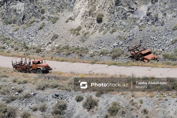 Yolun üzərində görünən texnika qalıqları Ermənistan silahlı qüvvələrinə məxsusdur. Hərbi texnika 44 günlük müharibə zamanı məhv edilib.