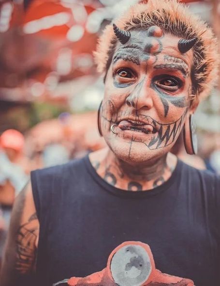 Belə ki, o, dərinin 70%-ni rəsmlərlə örtüb, əlinə yeddi silikon implant quraşdırıb və alnında buynuz şəklində transdermal pirsinq etdirib.