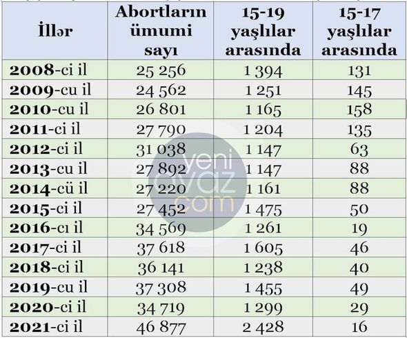 Yeniavaz.com-un açıqlanan sonuncu rəsmi məlumatlara istinadən apardığı hesablama göstərir ki, abort etdirən qadınların sayı 2020-ci illə müqayisədə ötən il 35% və ya 12 158 nəfər artaraq 46 877-ə yüksəlib. Bu, indiyə kimi Azərbaycanda qeydə alınan ən yüksək göstərici olub.