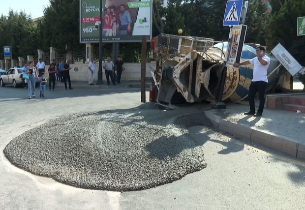 Belə ki, betonqarışdıran maşın idarəetmədən çıxaraq yol kənarına aşıb. Nəticədə yük avtomobilinin çənində olan beton yola dağılıb.