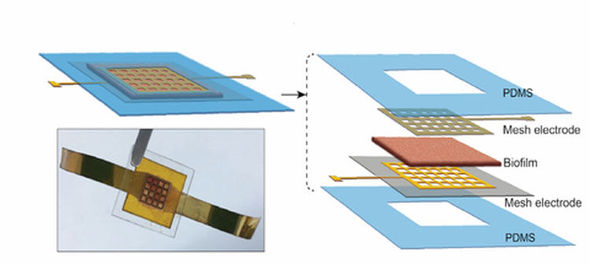“G.sulphurreducens” bakteriyalarının koloniyaları ayrı-ayrı hüceyrələr arasında sıx bağlarla nazik təbəqələr şəklində böyüyür. Bu plyonkalardan istənilən formanı kəsmək mümkündür. Alimlər də lazerdən istifadə edərək lazım olan formada onu doğrayıblar. Daha sonra bakteriyadan olan plyonka elektrodların arasına qoyulub və yumşaq, yapışqan, nəfəs ala bilən polimerlə möhürlənib.