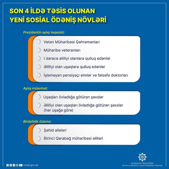 2021-ci ildə daha bir sıra yeni sosial ödənişlərin: Vətən Müharibəsi Qəhrəmanlarına (onlardan vəfat edənlərin ailə üzvlərinə), işləməyən pensiyaçı elmlər doktorlarına, işləməyən pensiyaçı fəlsəfə doktorlarına Prezidentin aylıq təqaüdünün, valideynlərini itirmiş və ya valideyn himayəsindən məhrum olmuş uşaqları övladlığa götürən şəxslərə, sağlamlıq imkanları məhdud uşaqları övladlığa götürən şəxslərə hər uşaq üçün aylıq müavinətin təyin edilməsinə başlanıb.