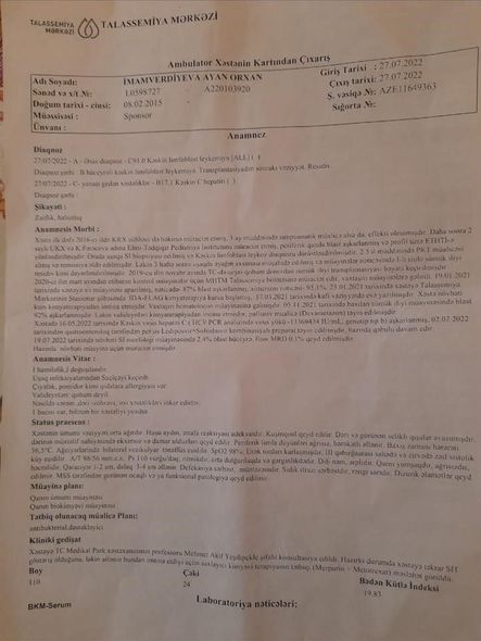 “Övladım beş ildir ki, bu xəstəlikdən əziyyət çəkir. Bu xəstəliklə yanaşı Hepatit C ilə də mübarizə aparır. Ona sümük iliyi nəql edilsə də, xəstəlik bir il sonra yenidən baş qaldırdı. Hazırda vəziyyəti ağırdır. Bütün bədəni şişib. Saturasiyası düşüb. Qızım Türkiyədə müalicə olunmalıdır. Bizim bir kurs müalicəmiz 4 min manata başa gəlir. İllərdir bu xəstəliklə mübarizə apardığımız üçün artıq maddi olaraq tükənmişik. Ayan isə artıq çox yorulub, iynələr bütün qollarını göyərdib. Onu belə gördükcə biz də məhv oluruq. Heç bir valideynə belə günlər yaşamağı arzu etmirəm.