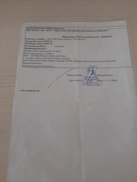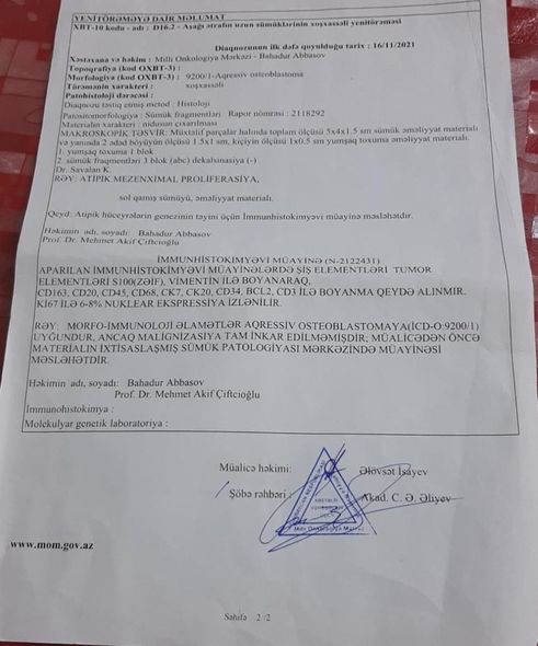 “Qızımın cəmi 23 yaşı var. Bakı Dövlət Universitetinin məzunudur. Qəfildən ayağında şiddətli ağrılar başladı. İlk dəfə ayağından biopsi götürüldükdə dəqiq diaqnoz qoyulmadı. Lakin ikinci dəfə biz onun xəstəliyinin nə olduğunu öyrəndik. Ona Osteoblastoma (Osteoblastoma ölçüsü adətən 2 santimetrdən çox olan xoşxassəli sümük törəməsidir) diaqnozu qoyuldu. Qızım hazırda çox güclü ağrıkəsicilər qəbul edir. Ayağının amputasiya olunması ilə qarşı-qarşıyayıq. Lakin Türkiyədə özəl xəstəxanalardan birindən bizə ümid verdilər ki, onun ayağını xilas edə biləcəklər. Bunun üçün bizə lazım olan 80 min dollardan cəmi 10 min dolları xeyirxah insanların dəstəyi ilə yığılıb. Qızımın arzuları çoxdur. Onun bu istəklərindən məhrum olmaması üçün bizə kömək edin”.