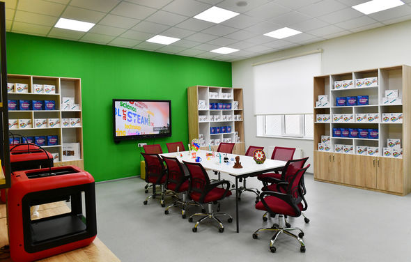 STEAM mərkəzi elektron lövhə, kompüter, 3D printer, müvafiq öyrədici qurğular, elektron komponentlər, dəftərxana ləvazimatları ilə təmin olunub. Burada, həmçinin mühəndis emalatxanası, dron uçuş otağı, təlim, robototexnika otaqları var.