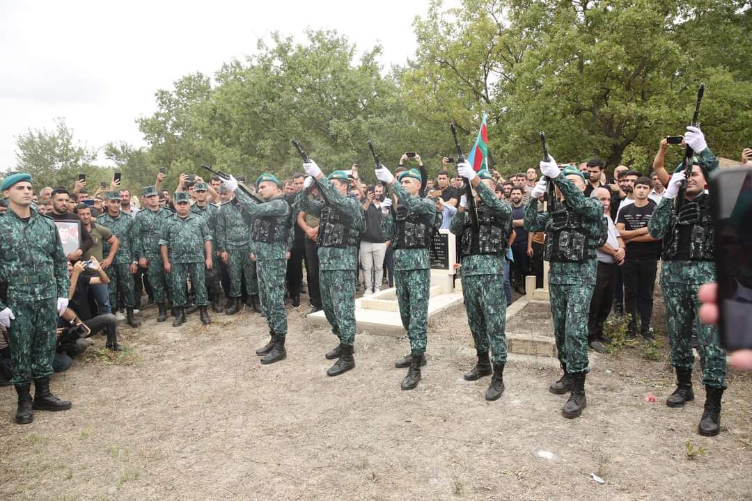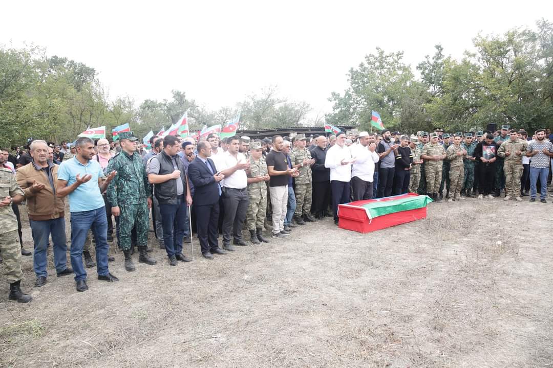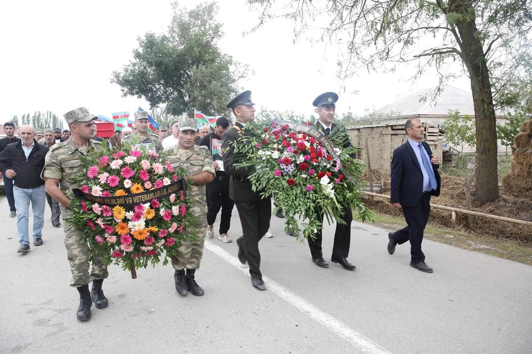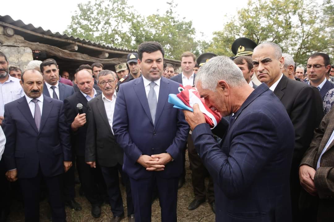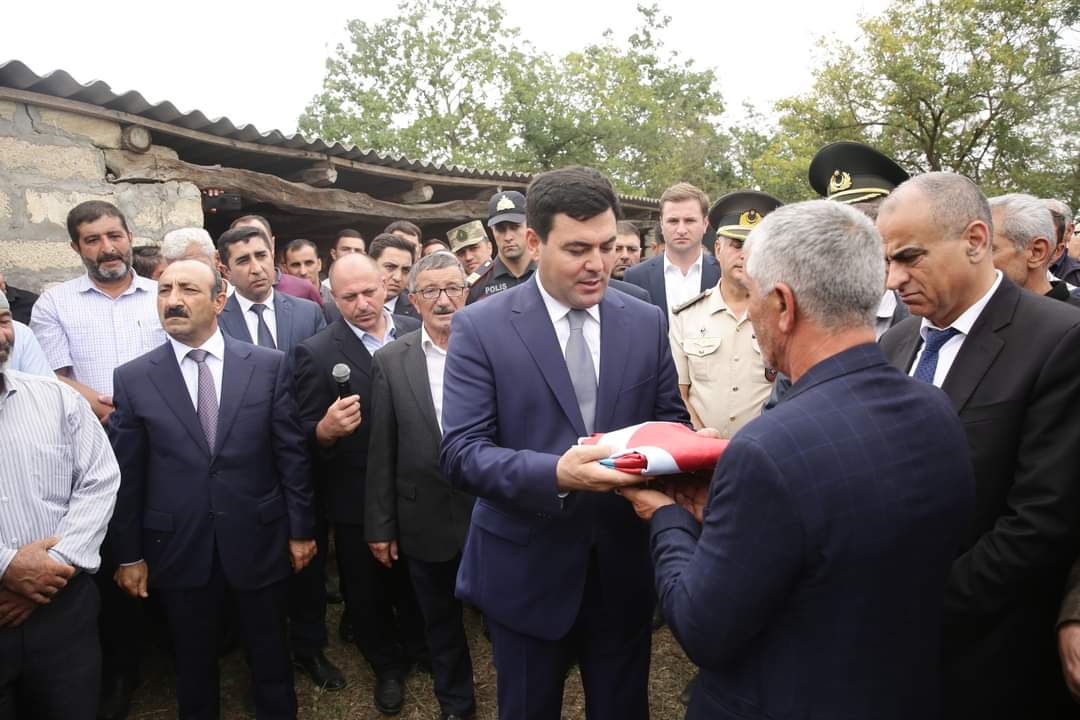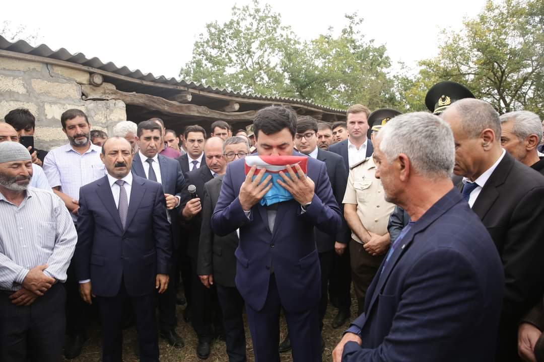 Şəhidin tabutu üzərindəki üç rəngli Azərbaycan bayrağı onun atasına təqdim olunub, havaya yaylım atəşi açılıb.