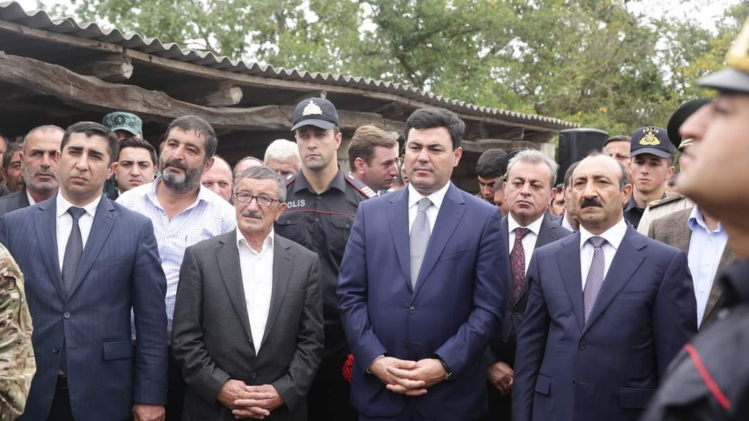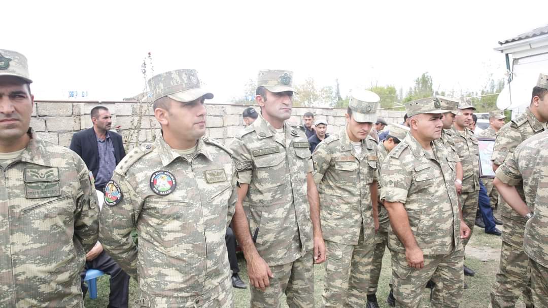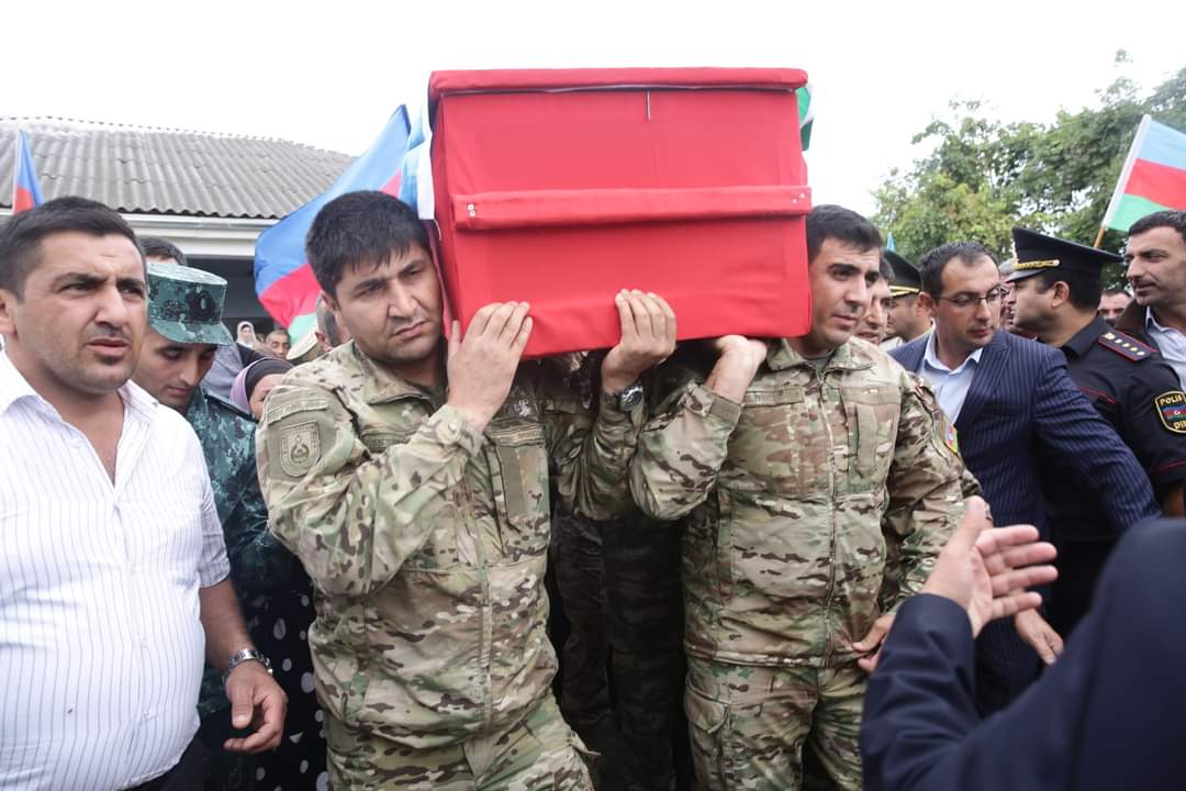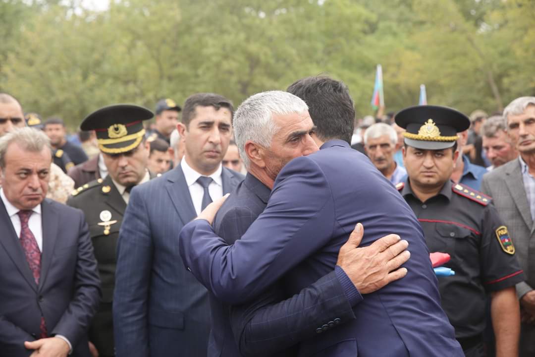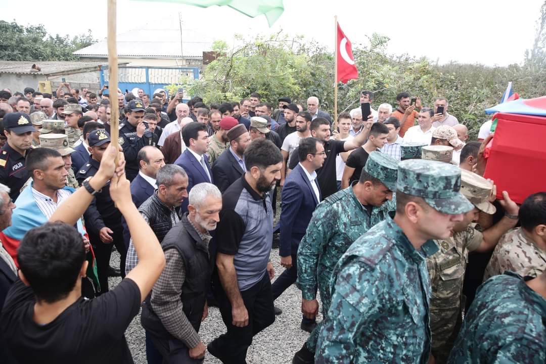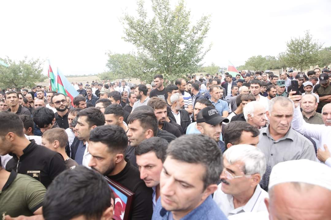Şəhidin tabutu üzərindəki üç rəngli Azərbaycan bayrağı onun atasına təqdim olunub, havaya yaylım atəşi açılıb.