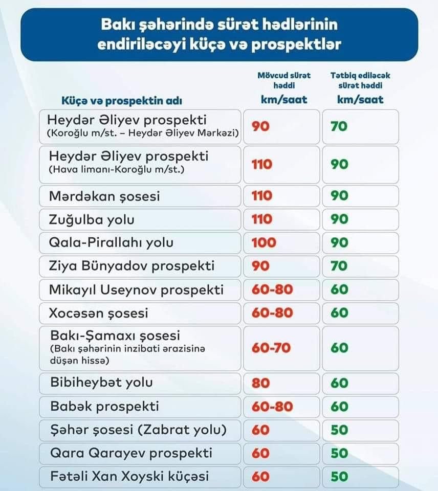 “Yaxın zamanlarda təqdim olunan siyahı ilə yanaşı, digər küçə və prospektlərdə daha təhlükəsiz hərəkət üçün sürət həddinin azaldılması nəzərdə tutulur”.