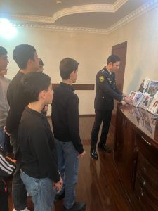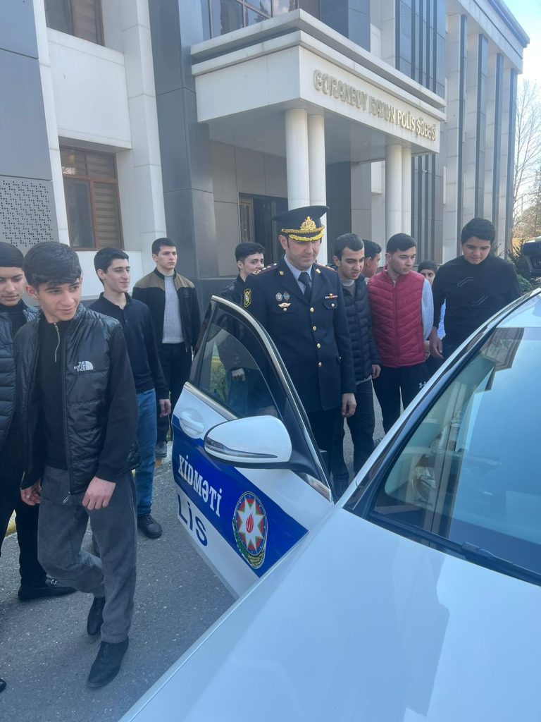 Polis Şöbəsinin inzibati binasında davam edən tədbirdə məktəblilər konfrans zalı, dərs otağı və xidməti otaqlarla tanış olublar, Növbətçi hissənin iş prosesini izləyiblər. Məktəblilərə izah olunub ki, burada polis edilən müraciətlərə təxirəsalınmaz və operativ şəkildə yanaşılır, onlara baxılması üçün lazımi tədbirlər görülür. Daha sonra şagirdlərə torpaqlarımızın azadlığı uğrunda canından keçən polis şəhidlərimiz haqqında geniş məlumat verilib.