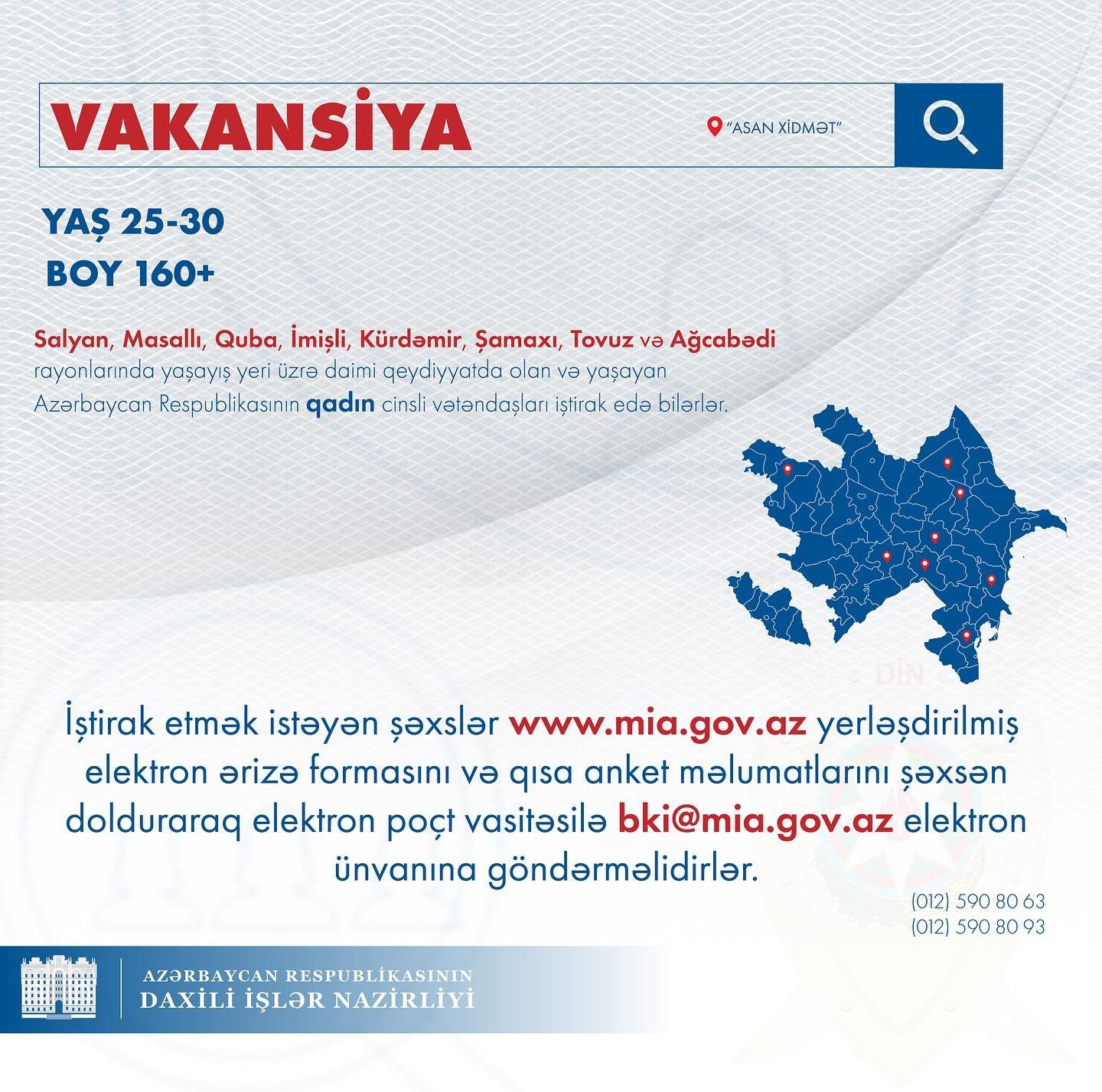 Daxili İşlər Nazirliyi Salyan, Masallı, Quba, İmişli, Kürdəmir, Şamaxı, Tovuz və Ağcabədi “ASAN xidmət” mərkəzlərində Daxili İşlər Nazirliyinin göstərdiyi xidmətlər üzrə vakant kiçik rəis heyəti vəzifələrinə xidmətə qəbulla əlaqədar müsabiqə elan edir.