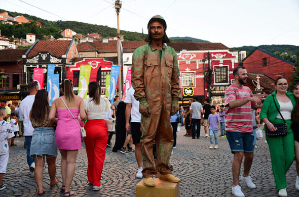 “Prizrenfest Açıq Hava Teatr Festivalı” çərçivəsində Şimali Makedoniyanın paytaxtı Skopyedən gələn sənətçilər bütün bədənlərini rəngləyərək, saatlarla hərəkətsiz dayanaraq real və ya xəyali insanları təsvir ediblər.