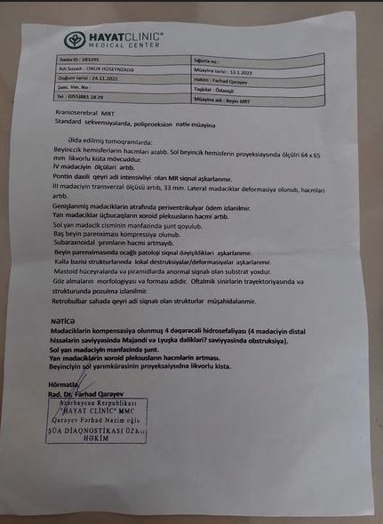 “Onurun iki yaşı var. Anadangəlmə hidrosefaliya xəstəliyindən əziyyət çəkir. Bu günə kimi dörd dəfə əməliyyat keçirib. Doğulan gündən müalicələrinin, əməliyyatlarının hamısını etmişik. Yenidən bir əməliyyat olmalıdır. Amma bunu qarşılamağa maddi gücümüz yoxdur. Dəyərli əşyalardan tutmuş, qızıllarıma qədər satmışam, inanın satmağa heç nəyim yoxdur”.