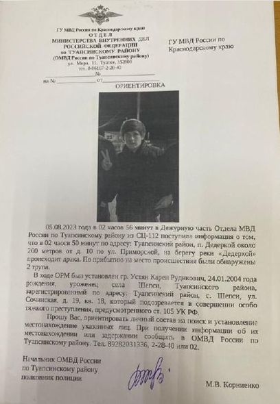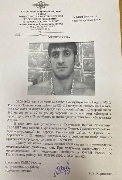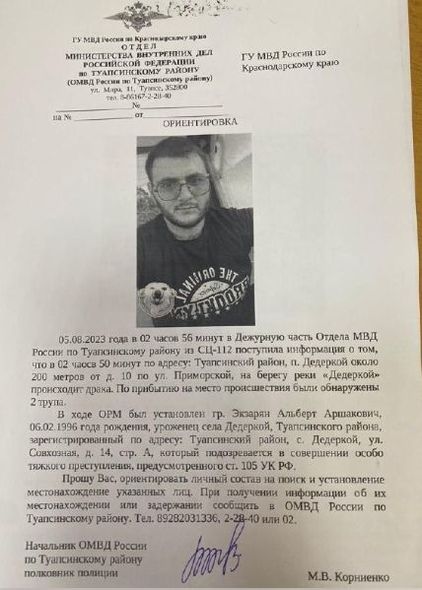 Şənbə günü səhər saat 3 radələrində Tuapse rayonunun növbətçi hissəsinə çayın sahilində yerləşən Dederkoy kəndində dava olması barədə məlumat daxil olub. Hadisə yerinə gələn hüquq-mühafizə orqanlarının əməkdaşları dava aşkar etməsələr də, onun nəticələrini – zorakılıqla ölüm əlamətləri olan 37 və 41 yaşlı iki kişi meyitini aşkar ediblər.