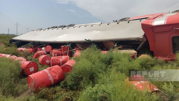 Nəticədə TIR yoldan çıxaraq aşıb. Nəqliyyat vasitəsinin qoşqusunda olan yüklər yola dağılıb.