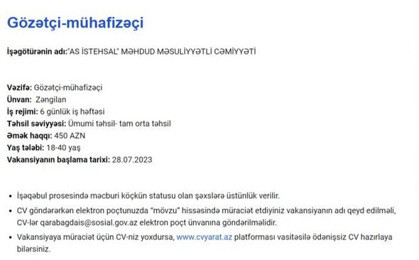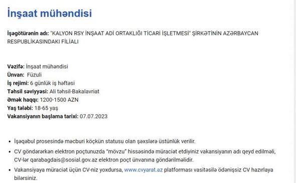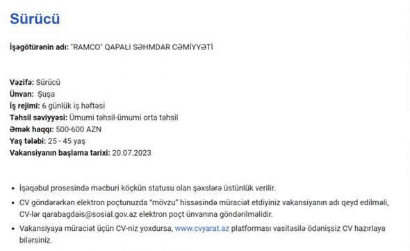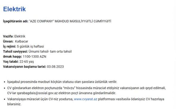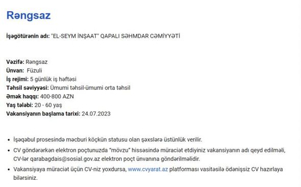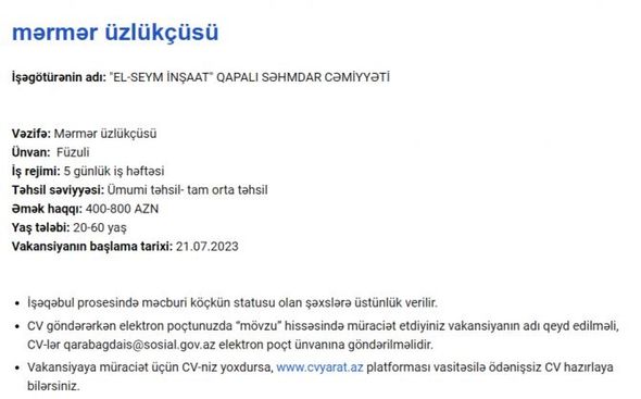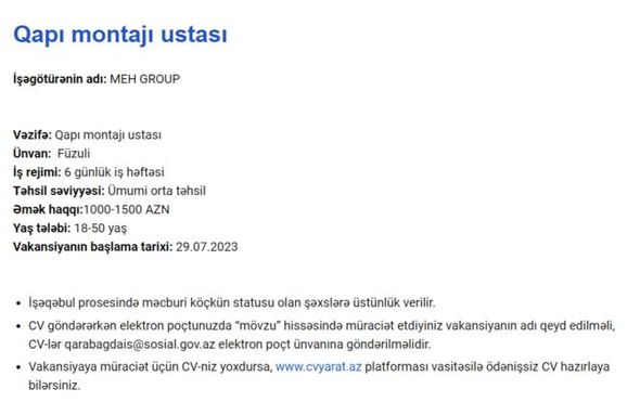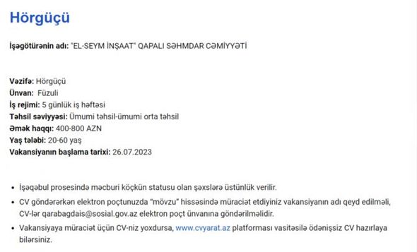 Vakansiyalar əsasən xidmət və tikinti sahəsi üzrədir. Cəbrayıl, Zəngilan, Şuşa, Füzuli və Kəlbəcər rayonları üzrə vakansiyalar Dövlət Məşğulluq Agentliyi tərəfindən təqdim olunur. Əməkhaqları 450-2300 AZN arasında dəyişir.