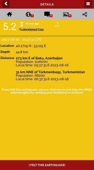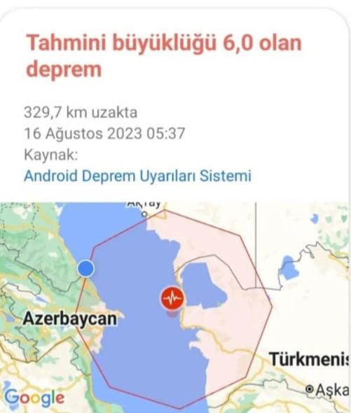 Qeyd edək ki, Türkmənistanda yerli vaxtla saat 05:37-də 5,0 bal gücündə zəlzələ qeydə alınıb. Yeraltı təkanların episentri Türkmənbaşı şəhərindən 52 kilometr şimalda, Bakı şəhərindən 272 km şimal-şərqdə, ocağı isə 47 kilometr dərinlikdə olub.