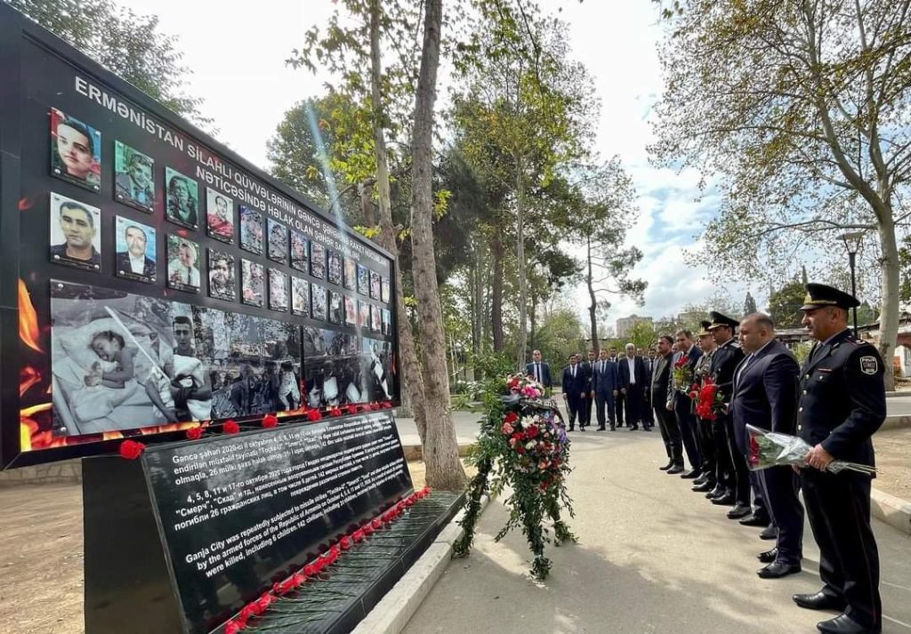 Azər Qocayev Gəncə şəhərində raket və mərmilər nəticəsində həlak olmuş şəxslərin xatirəsinə ucaldılmış abidəni ziyarət edib