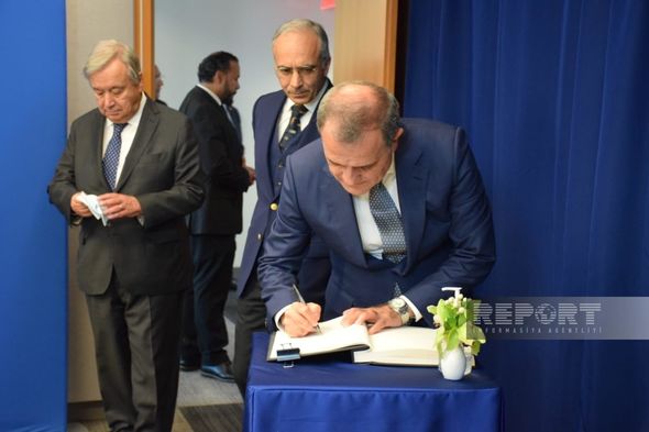 “Report”un ABŞ bürosu xəbər verir ki, nazir öncə BMT-nin xatirə dəftərinə ürək sözlərini yazıb. A.Quttereş və C.Bayramov diplomatlar görüşdən öncə xatirə fotosu çəkdiriblər.
