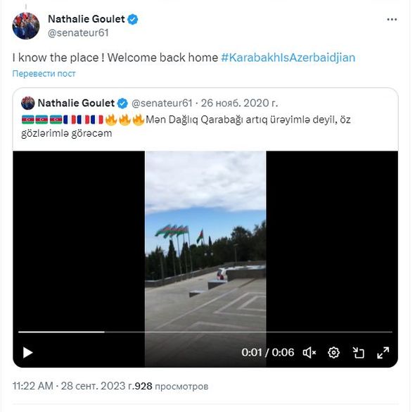 Fransa Senatının üzvü Natali Qule növbəti dəfə Azərbaycana dəstək nümayiş etdirib.