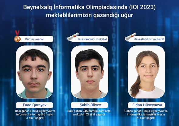 Belə ki, Bakı şəhəri Fizika, riyaziyyat və informatika təmayüllü liseyin X sinif şagirdi Fuad Qarayev bürünc medal, Bakı şəhəri 245 nömrəli tam orta məktəbin XI sinif şagirdi Sahib Əliyev və Gəncə şəhəri Fizika, riyaziyyat və informatika təmayüllü liseyin XI sinif şagirdi Fidan Hüseynova isə həvəsləndirici mükafat qazanıblar.