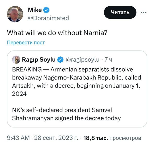 ABŞ-nin Hudzon Universitetinin Yaxın Şərqdə Sülh və Təhlükəsizlik Mərkəzinin direktoru Maykl Doran Azərbaycan ərazisindəki separatçı qurumun ləğvi ilə bağlı ironik paylaşım edib.