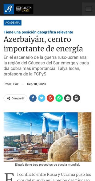 Latın Amerikasının ən nüfuzlu təhsil ocaqlarından biri olan Meksika Milli Muxtar Universitetinin (UNAM) mətbu orqanı “Gaceta UNAM” qəzetində “Azərbaycan mühüm enerji mərkəzidir” başlıqlı məqalə dərc olunub.