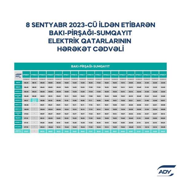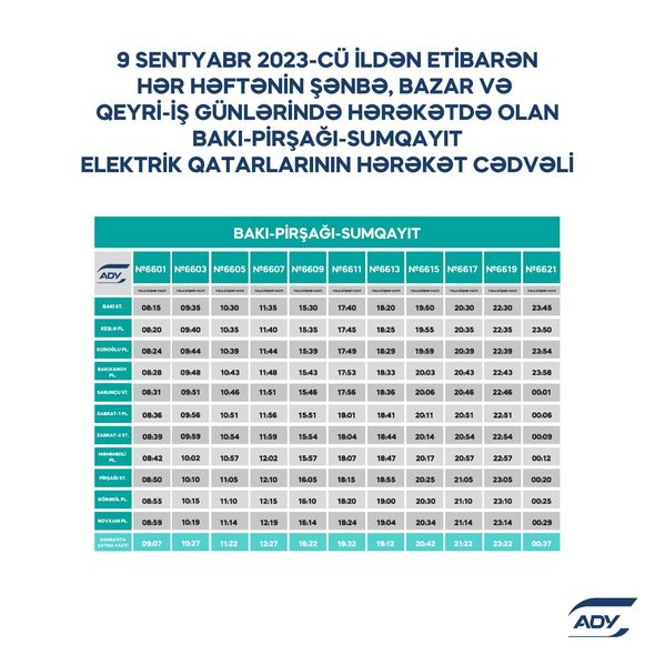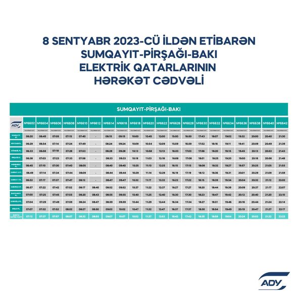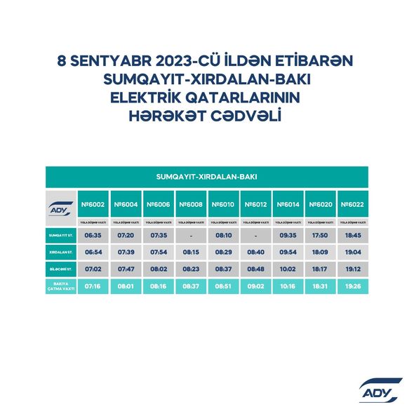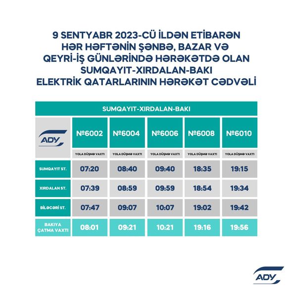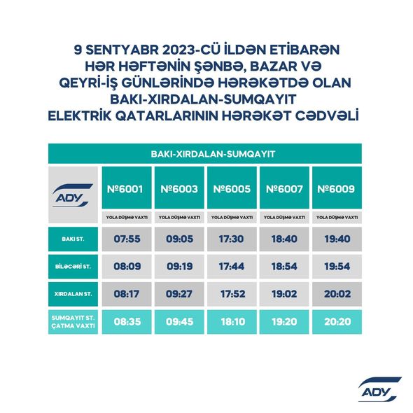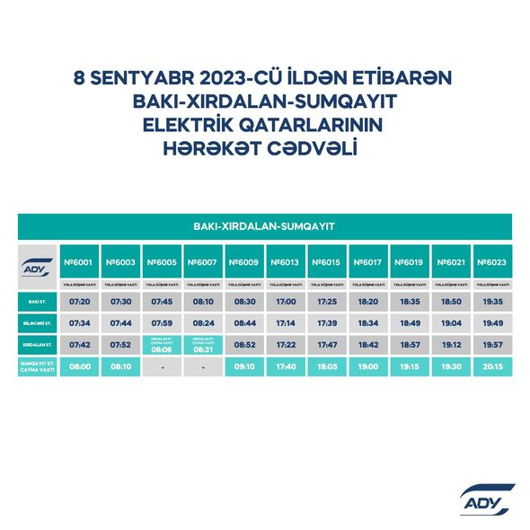 “Azərbaycan Dəmir Yolları” QSC (ADY) 2023-2024-cü tədris ilinin başlanması ilə əlaqədar sərnişindaşımada yarana biləcək hərəkət sıxlığının qarşısının alınması və sərnişinlərin məmnuniyyətinin təmin edilməsi məqsədilə hərəkət cədvəlini optimallaşdırır. Belə ki, Bakı-Xırdalan-Sumqayıt marşrutu üzrə səhər saatlarında iki reys, axşam saatlarında bir reys, Bakı-Pirşağı-Sumqayıt marşrutu üzrə isə axşam saatlarında bir reys əlavə olunub.