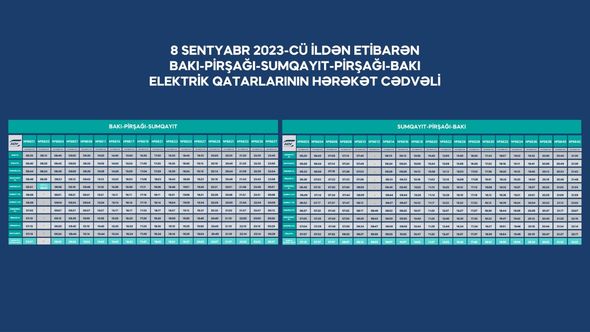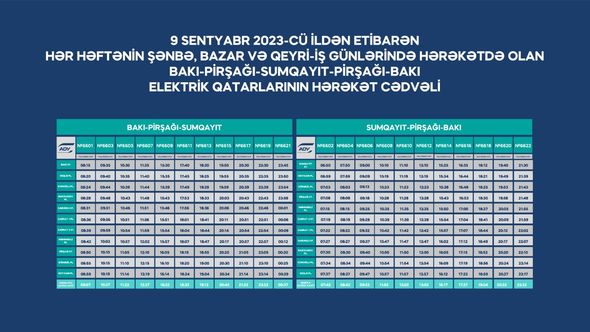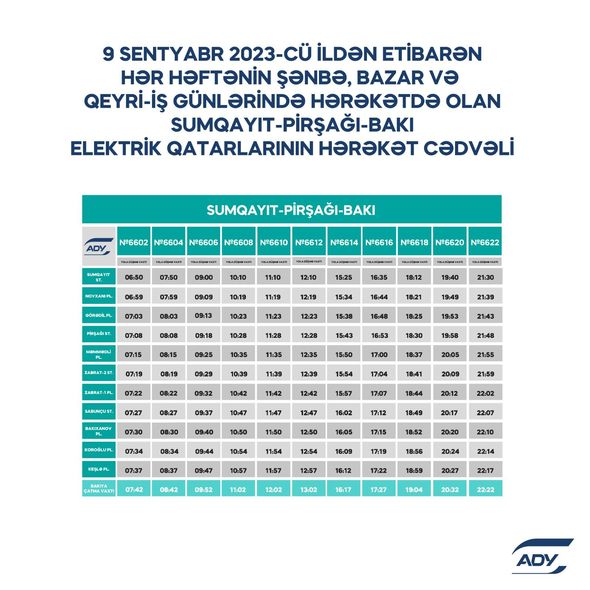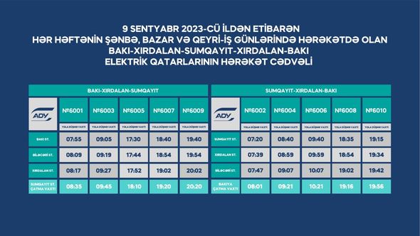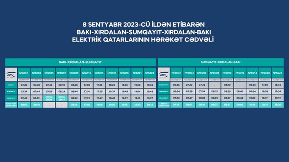 8 sentyabr 2023-cü il tarixindən etibarən Abşeron dairəvi dəmir yolu xətti üzrə hərəkət edən şəhərətrafı sürət elektrik qatarları yenilənmiş hərəkət qrafiki üzrə fəaliyyət göstərəcək.