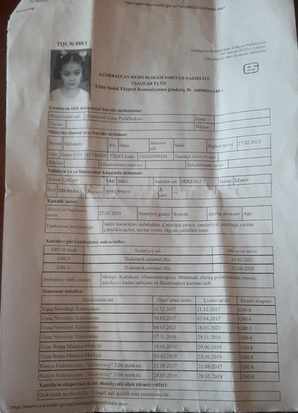 “Əsna artıq 10 ildir, serebral iflicdən əziyyət çəkir. Doğulduğu gündən müalicələrini vaxtı-vaxtında etsək də, çox böyük irəliləyiş əldə olunmayıb. Hazırda övladım ayağından əməliyyat edilməlidir. Bunun üçün isə biz İran İslam Respublikasına yollanmalıyıq. Əməliyyat üçün lazım olan 2 500 manatın 2 000 manatını yardımsevər şəxslərin dəstəyi ilə toplaya bilsək də, hələ 500 manatımız çatmır. Yardımsevər şəxslərdən bizə dəstək olmalarını xahiş edirəm”.