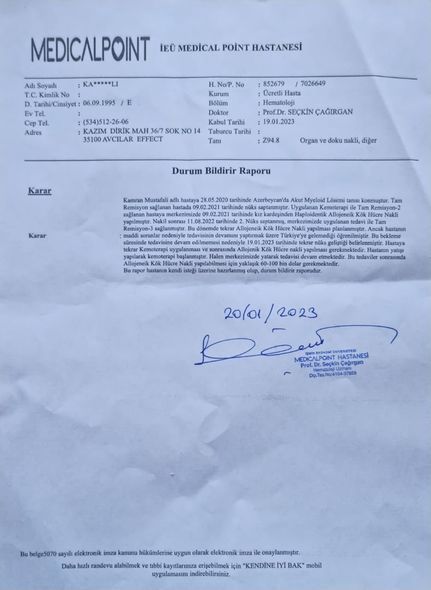 O bildirib ki, Kamran 2021-ci ildə bir dəfə ilik nəqli əməliyyatı keçirib.