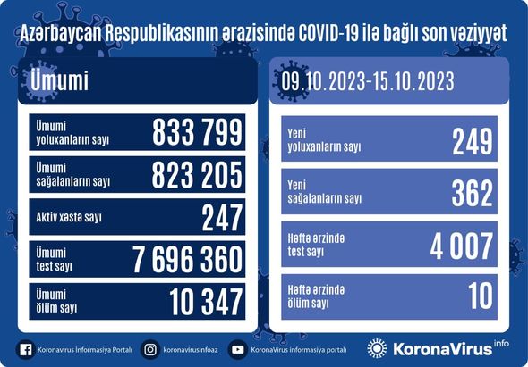 Azərbaycanda koronavirus (COVID-19) infeksiyasına son bir həftədə (09.10.2023-15.10.2023) 249 yeni yoluxma faktı qeydə alınıb, 362 nəfər müalicə olunaraq sağalıb.