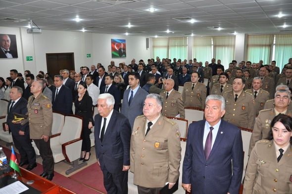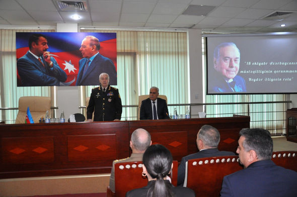 Tədbirdə çıxış edən fövqəladə hallar nazirinin müavini general-leytenant Etibar Mirzəyev Azərbaycan xalqının ən böyük sərvəti olan dövlət müstəqilliyinin qorunub saxlanmasının hər bir vətəndaşın ümdə vəzifəsi olduğunu vurğulayıb. Azərbaycan Xalq Cümhuriyyətinin süqutunu şərtləndirən səbəblərdən danışan nazir müavini ötən əsrin 90-cı illərinin əvvəllərində xalqımızın dövlət müstəqilliyini bərpa etmək imkanı əldə etdiyini, həmin dövrdə mürəkkəb tarixi şəraitdən, cəmiyyətin bütün sahələrini əhatə edən dərin böhrandan, yaranmış xaosdan bəhs edib. O, bildirib ki, məhz ulu öndərin parlaq siyasi zəkası, mükəmməl idarəçilik qabiliyyəti, böyük dövlətçilik təcrübəsi, mətin iradəsi və yorulmaz fəaliyyəti sayəsində milli dövlətimiz tarix səhnəsindən silinmək, xalqımız isə vətəndaş qarşıdurmasından qurtulub, dahi rəhbər tərəfindən bugünkü qüdrətli Azərbaycanın möhkəm və sarsılmaz özülləri atılıb. Ulu öndər tərəfindən yürüdülən müdrik daxili və xarici siyasət, həyata keçirilən hərtərəfli və dərin, elmi əsaslarla işlənib hazırlanmış konseptual islahatlar nəticəsində dövlət müstəqilliyimizin möhkəmləndiyini, respublikamızın beynəlxalq birliyin tamhüquqlu üzvünə çevrildiyini qürur hissi ilə dilə gətirən