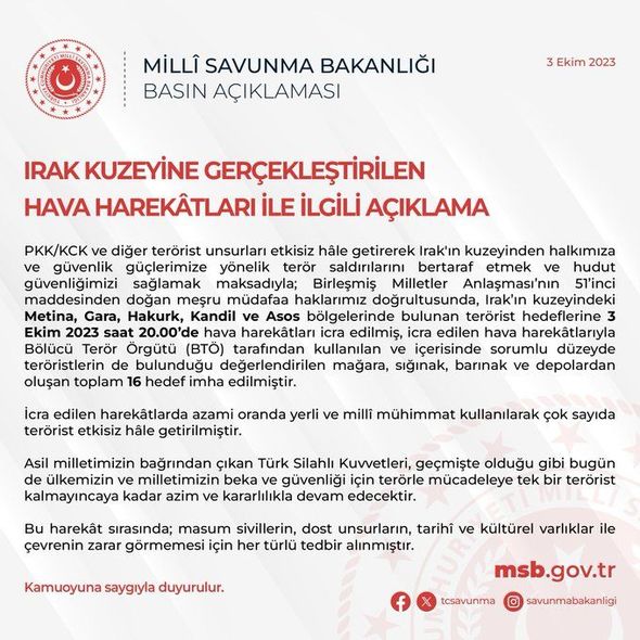Türkiyənin Müdafiə Nazirliyi İraqın şimalında həyata keçirilən hava əməliyyatında Metina, Qara, Hakurk, Qəndil və Asos bölgələrində 16 hədəfin məhv edildiyini açıqlayıb.