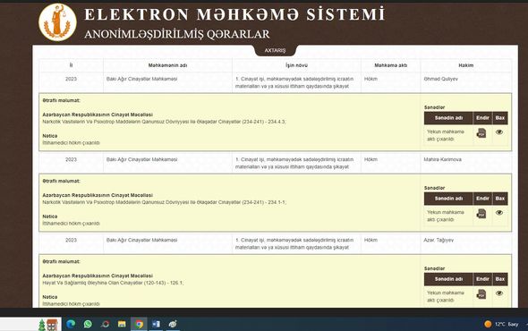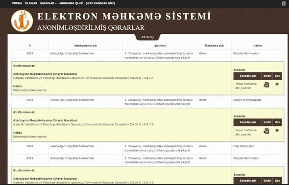 Azərbaycanın ağır cinayətlər məhkəmələrinin işlərində Cinayət Məcəlləsinin 234-cü maddəsinin (Qanunsuz olaraq narkotik vasitələri, psixotrop maddələri və ya onların prekursorlarını hazırlama, istehsal etmə, əldə etmə, saxlama, daşıma, göndərmə və ya satma) bir neçə bəndi ilə keçirilən və ya keçiriləcək proseslər çoxluq təşkil edir.