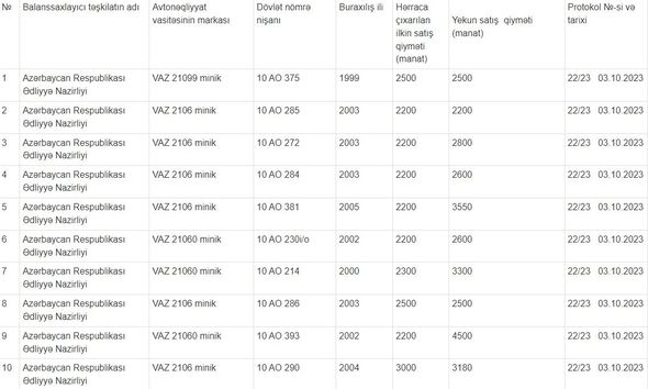 Qurumdan verilən məlumata görə, özəlləşdirilmiş nəqliyyat vasitələrinin siyahısı və yekun satış qiymətlərinin siyahısını təqdim edirik: