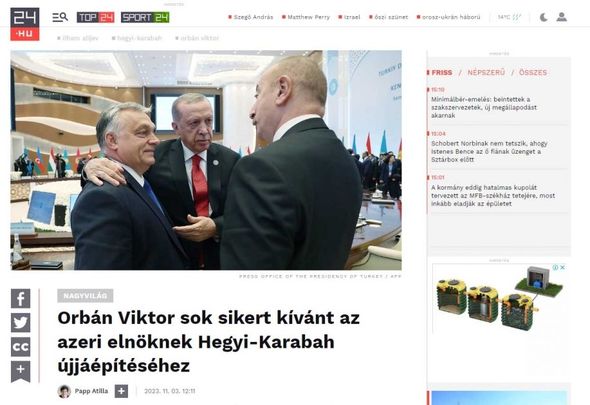 Macarıstanın “Hvg”, “24.hu”, “hirstart”, “rtl”, “444.hu”, “Magyar narancs”, “Telex”, “Szeged”, “Hirnavigato” saytları Baş nazir Viktor Orbanın Zirvə görüşündə Prezident İlham Əliyevi regionda sabitliyə nail olunması istiqamətində göstərdiyi səylərə və nailiyyətlər münasibətilə təbrik etdiyini, Qarabağın bərpası işlərinə uğurlar arzuladığını oxucuların diqqətinə çatdırıb.