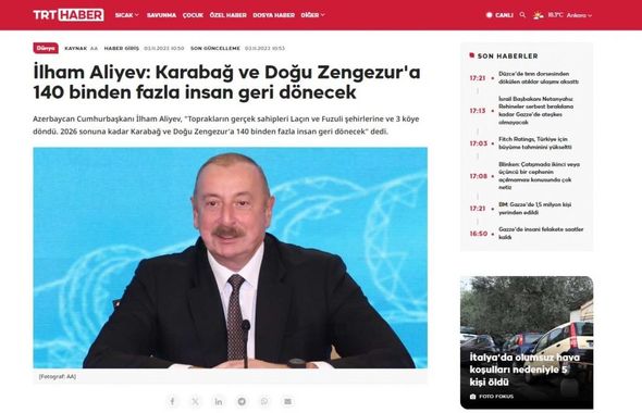 “TRT Haber”in yaydığı materialda Prezident İlham Əliyevin fikirlərinə istinad olunaraq, Qarabağdakı bərpa-quruculuq işlərinə Azərbaycan büdcəsindən 7 milyard dollar vəsait sərf edildiyi, gələn il azı 2,4 milyard dolların ayrılacağı bildirilir. Vurğulanır ki, Böyük Qayıdış Proqramı uğurla icra edilir, keçmiş məcburi köçkünlər Laçın və Füzuli şəhərlərinə və üç kəndə qayıdıb, 2026-cı ilin sonunadək Qarabağa və Şərqi Zəngəzura 140 mindən artıq insanın geri dönməsi nəzərdə tutulur.