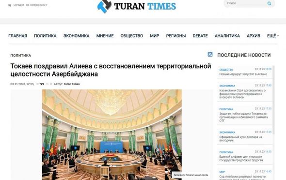 “Turan Times” saytı yazır ki, Qazaxıstan Prezidenti Kasım-Jomart Tokayev Zirvə görüşündə Azərbaycan Prezidenti İlham Əliyevi və xalqımızı ölkəmizin ərazi bütövlüyünün bərpası və dövlətçiliyin möhkəmləndirilməsi münasibətilə təbrik edib. Kasım-Jomart Tokayev deyib ki, Azərbaycanın öz ərazi bütövlüyünü təmin etməsi Birləşmiş Millətlər Təşkilatının Nizamnaməsinə və Təhlükəsizlik Şurasının qətnamələrinə uyğun olaraq atılıb.