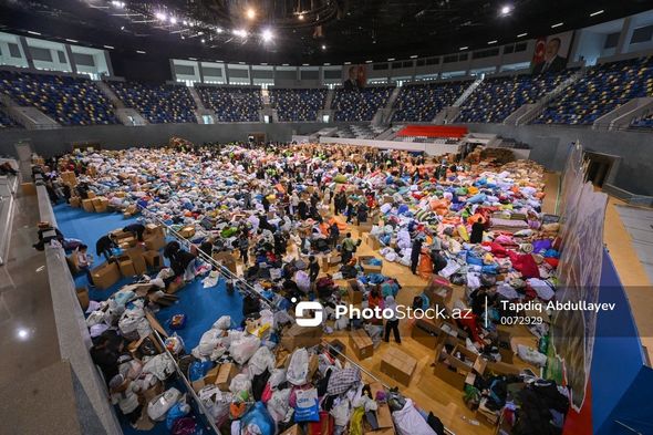 Yuxarıdakı fotoda təbii fəlakətdən sonra Azərbaycanda qardaş ölkəyə toplanan yardım kampaniyası əks olunub.