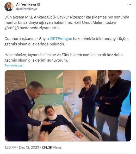 Ali Yerlikaya Superliqada oynanılan “Ankaragücü”- “Çaykur Rizəspor” matçından sonra “Ankaragücü”nün prezidenti Faruk Koca və digər şəxslərin hücumuna məruz qalan hakim Halil Umut Meleri müalicə aldığı xəstəxanada ziyarət edib. Ziyarət əsnasında Rəcəb Tayyib Ərdoğan döyülən hakimlə telefonda söhbət edib və ona tezliklə sağalmasını diləyib.