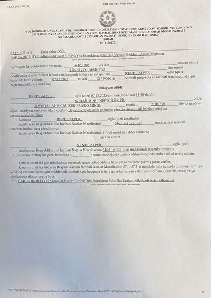 “Türkiyəli bloqer Alper Rendenin icarə əsasında idarə etdiyi avtomobilə qayda pozuntusuna görə dekabrın 7-də Səbail rayonu Neftçilər prospektində inzibati xəta haqqında protokol tərtib edilib, cərimə məbləği ödənilib”.