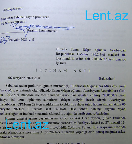 Qeyd edək ki, Hadisəni törədən Eynur Əlizadə 1993-cü ildə Naxçıvan Muxtar Respublikasında anadan olub, əvvəllər məhkum olunmayıb. Faktla bağlı Sabunçu rayon prokurorluğunda Cinayət Məcəlləsinin 120.1-ci (qəsdən adam öldürmə) maddəsi ilə cinayət işi başlanılıb.