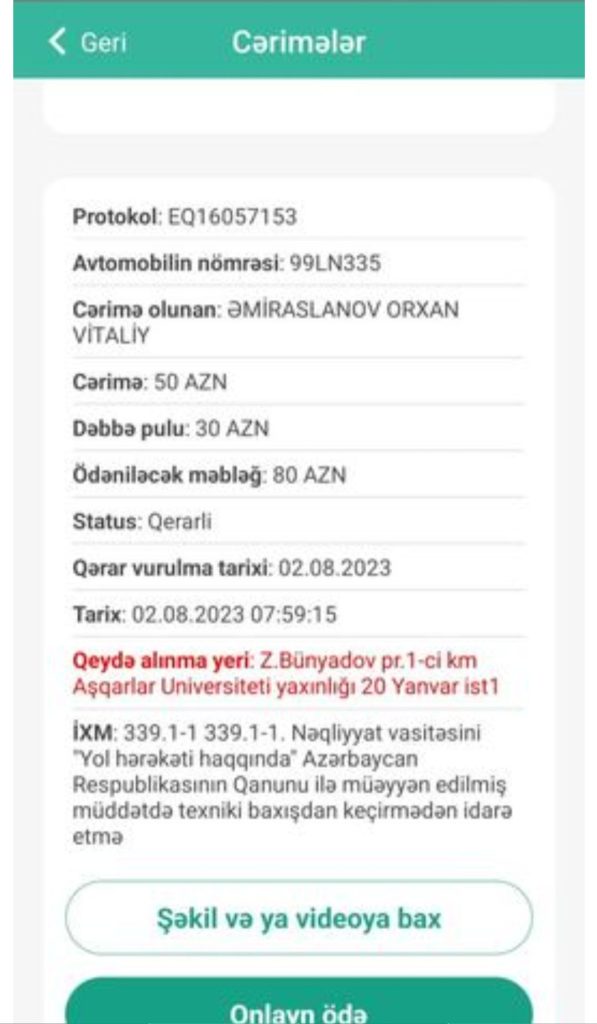 “Vətəndaşın törətdiyi digər qayda pozuntuları ilə bağlı mərkəzi informasiya sistemində hər hansı bir ödəniş mövcud deyildir”.